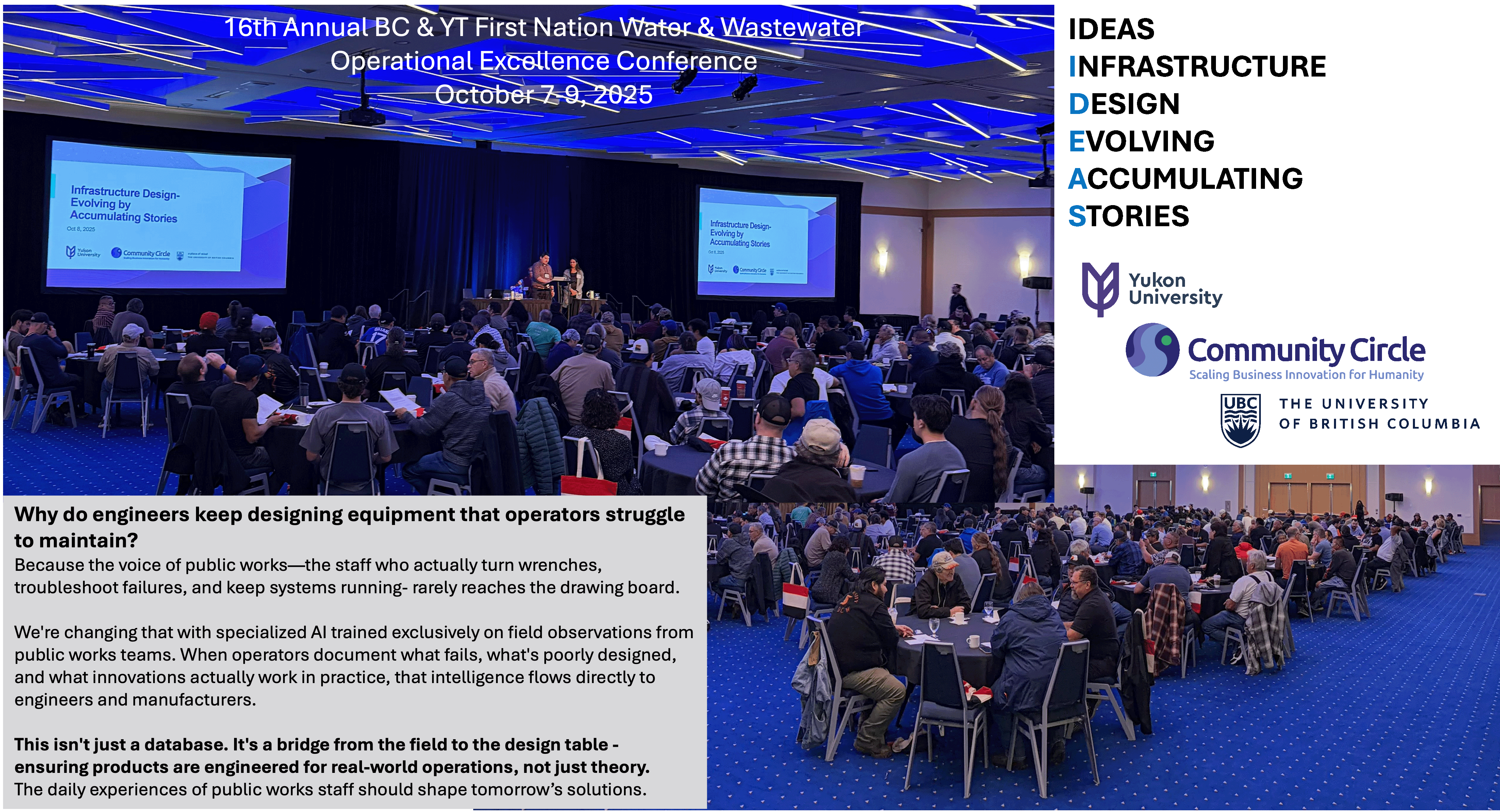 INFRASTRUCTURE DESIGN EVOLVING ACCUMULATING STORIES (IDEAS) launched at the 16th Annual BC & YT First Nation Water &Wastewater, Operational Excellence Conference, October 7-9, 2025 | Vancouver, BC - Presented by Ewan McDonald and Bavisha Kalyan